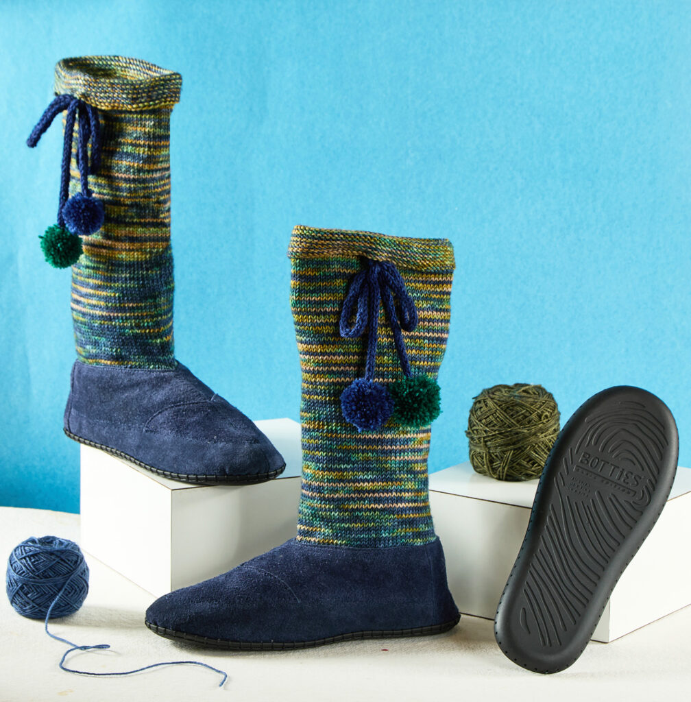 Wer handarbeitstechnisch nicht festgelegt ist, wird seine kreative Freude haben an diesen genähten Stiefeln mit gestricktem Schaft!